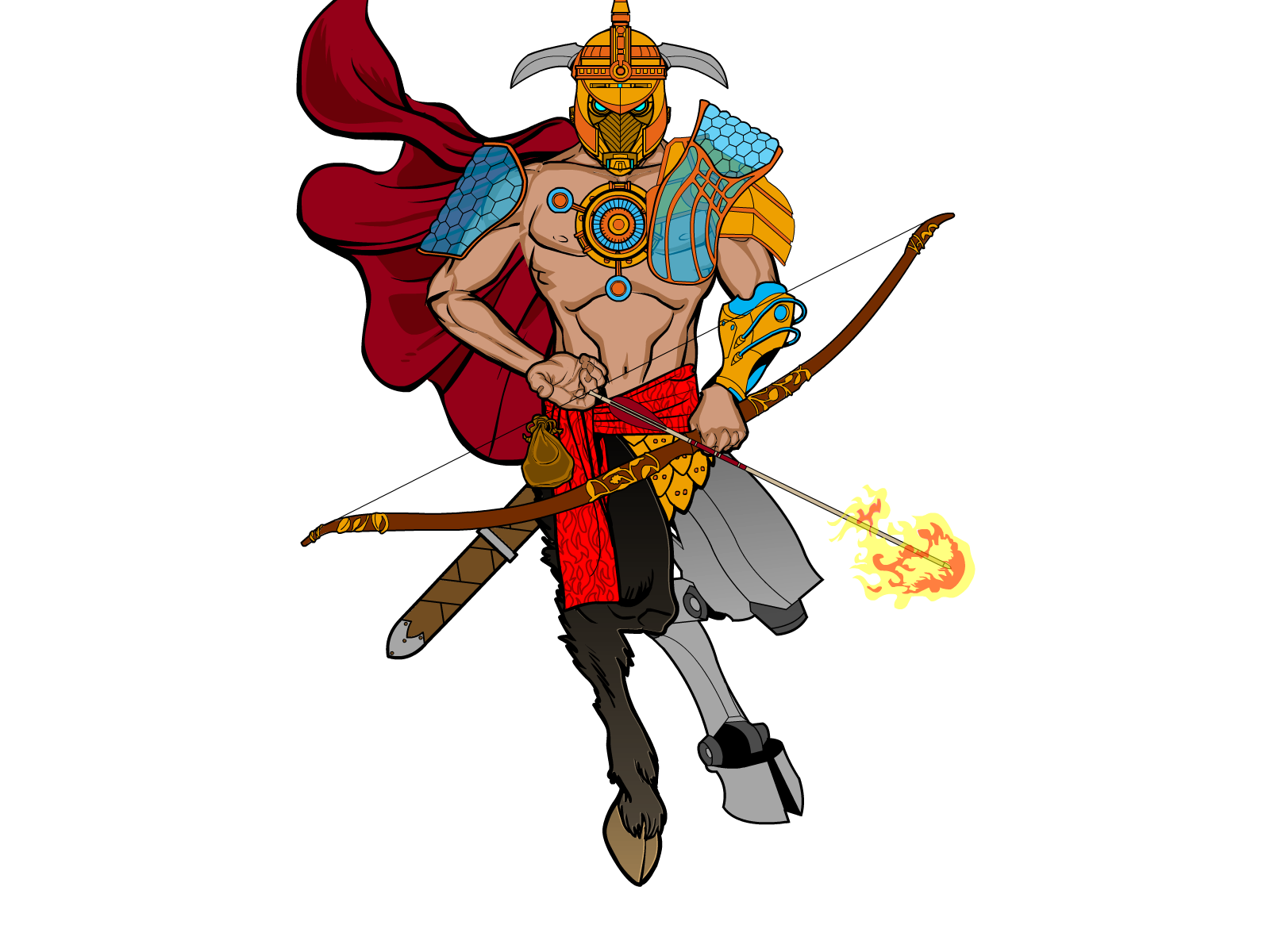 Pesky's "Cybertaur" has a lot of great elements to it, from the way it has a great flow to it, to the combination of real and artificial satyr legs, to the nice item choices, to the way the bow is being held (although the string should technically be on the other side of the forearm). A great image bursting with energy!
