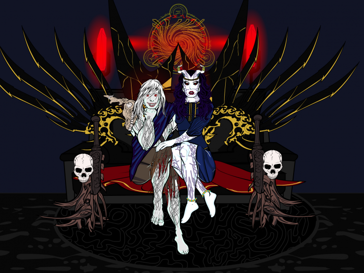 Upon the Nightmare Throne (in the realm of the same name) sit the greatest of the Kar’Sol, the Dark Deities. Erevel is the god of madness, trapped in the primeval sea at the beginning of time only to emerge dark, twisted, and mad. He is pallid, unable to bear bright light even now. With him sits his wife, Baria, nightmare goddess and creator of their realm. Daughter of the weaver of dreams, she saw Erevel for what he was and willingly joined him, taking the same corruption into herself. They share a deep bond of devotion to one another, sharing no affection for any other creature, not even their own children. A nexus of power hums gently behind their spiked double throne, ready to obey the will of it’s master and mistress in an instant. Few have ever stood before this throne, and fewer still return.