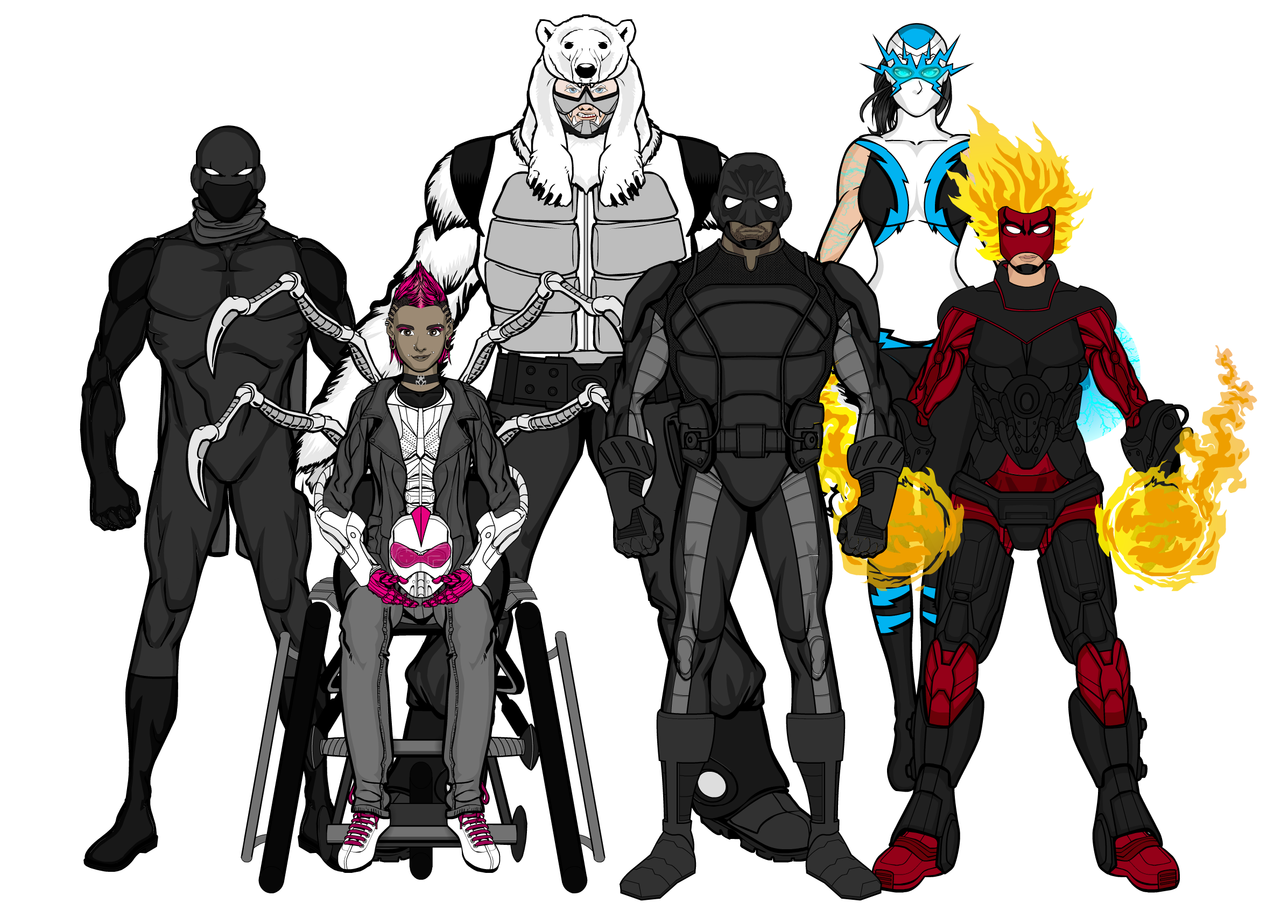 After the Golden Cross managed to take over W.I.L.D from within, new W.I.L.D Director James Rush decided that they needed a safety measure to prevent such an occurance from happening again. So he set to work with A Division member Luis Deacon (Blackstar) to create a team seperate from The Protectors to act as a counter-intelligence unit for W.I.L.D itself. However, as the team began to come together, both realised that, not only would this new team have to operate completely seperate from W.I.L.D, let alone The Protectors, but would be better served focusing on preventing and fighting threats to society that W.I.L.D is unequiped to fight, due to its status as a law enforcement agency. So, with a secret budget of W.I.L.D R&D funds, Deacon, now calling himself Catalyst, assembled his team. He brought Prodigy and Stinger with him from A Division, although Stinger is now confined to a support role due to damage taken to her mobility suit in the battle against Omnion. He also recruited former adversaries, Polar Bear, Voltea and Inferno, due to their previous motivations and MO’s being suitable for the job at hand (and of course, it’s better to have someone to take the fall). With the team assembled, The Saviours set out to do the seemingly impossible, save the world from itself.