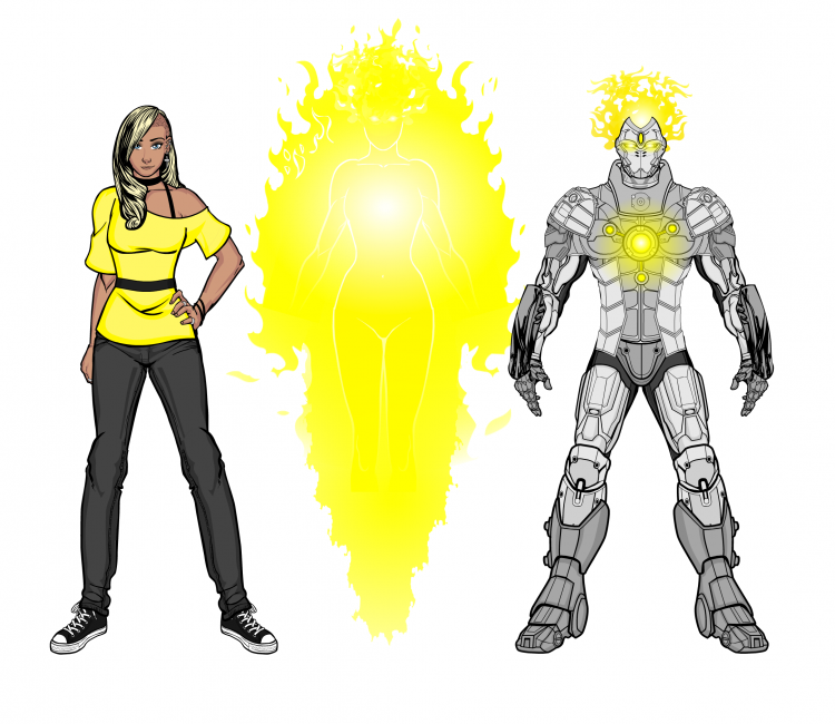 Maya Madison was once a normal girl. She enjoyed shopping, music, hanging out with her friends, normal stuff. But her life changed irrevocably when she came into contact with the Cosmic Force. Barely anything is known about the Cosmic Force, other than it came into existance alongside The Eldar (the cosmic beings that personify the fundamentals of the universe; life, death, time, space and reality) and it is known by numerous names, such as “The Ancient Sun”, “The Light of The Universe” and the “Corona” (as its brilliant glow reminded people of the sun). Even Maya doesn’t know how she found the Cosmic Force, it is entirely possible that it is somewhat sentient and sought her out, but this raises even more questions (why Maya being the primary one). However, what happened next is even more interesting. Maya fused with the Cosmic Force, becoming a being of pure heat and light. Struggling to retain a physical form that resembled something close to a human body, Maya began to burn. She burnt so fast and so hot that everything around her was incinerated for a radius of 3 miles. This sudden explosion of energy did not go unnoticed. It attracted everyone, The Protectors, Team Supreme, even the Galactic Guard and The Veil of The Eldar. The Veil managed to control the energy of the Cosmic Force around Maya, but it was too late to seperate her from it. Now reduced to little more than a psychic ghost within the corona, everything that was Maya Madison was almost completely wiped out by the immense power that overwhelmed her body, only her mind remained. The Veil fashioned a containment suit to allow Maya to interact with the physical world, whilst also constraining the power of the Cosmic Force, and now Maya wanders the stars, looking for a way to return to normal, knowing that she is just too dangerous to return home otherwise.