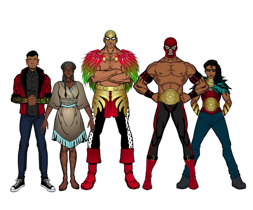 CAMPEÓN – Campeón Sato-Gonzalez: He is the son of legendary Mexican superhero: CUAHTEMOC, a fearless luchador with insane strength. Campeón’s mother is TONANTZIN, a Mejica priestess and a natural mystic. . From his father Campeón inherited high-level superhuman strength and durability, as well as extensive training in combat. He is married to Hideki Sato, a passing family acquaintance in childhood, turned trusted mystic consultant early in his superhero career, turned love of his life. Campeón values his family greatly. He always tries to alleviate tensions between his parents and younger siblings, and is a doting uncle to both Claire and Gabriel.