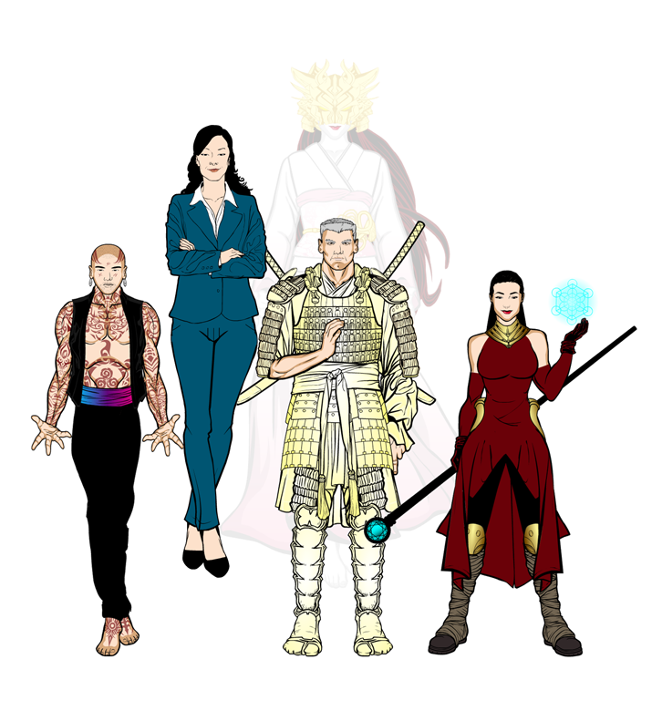 SHINING SAMURAI – Hideyoshi Sato – An incredibly accomplished superhero, empowered by a brilliant set of mystic armor and twin katanas. Together with Solarion, Hideyoshi was a founding member of the Honor Guard and a constant in its revolving roster. On one particular mission the Honor Guard came into contact with an insane archaeologist in possession of an incredibly powerful mystic artifact. When the artifact shattered the team found themselves scattered across the dimensions. Hideyoshi was stuck in a celestial plane, inhabited by the Kami of Japanese legend. There he met… her. She never gave him her name, but he was instantly in love with her. Solarion, with help from Tonantzin and other mystic consultants, found a way to retrieve his scattered teammates. For him, only a few days had passed, but for Hideyoshi, it had been years. When Solarion came to retrieve him, Hideyoshi was infused with mystic energy, far more powerful than he once was, and had three children with him: Ichiko, Megumi, and Hideki. The Kami urged Hideyoshi to take their children back to the mortal plane. She wanted them to experience the joys of the human experience: love, family, kindness. Leaving her hardened Hideyoshi’s heart, so despite having his children with him, he became distant and cold. Ichiko largely helped raise her siblings and grew up far too fast, as a way to cope with Hideyoshi’s long absences adventuring. His relationship with the three siblings remains somewhat strained.