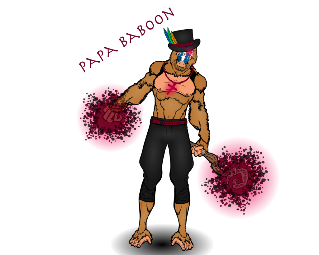 LefParticipantThis is Papa Baboon. Part of a team of experiments on human and animal DNA. Former voodoo/black magician of a tribe, his DNA was fused with that of a baboon. He still uses his voodoo and with the rest of the victims of the experiments, he tries to stop the corporation behind them. (still brainstorming a name for the team)