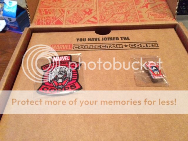 When you first open the box you get the first flap which holds the patch and pin, the patch is a fabric patch of Ultron and it says Marvel Collector Corps, the pin is of Cap.
