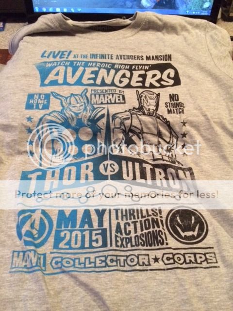 Next is the T-Shirt, there was 4 different shirts all the same style only difference is the hero, one of Hulk in green, on of Cap in dark blue, one of Thor in light blue and one of Ironman in red. I got the Thor (wanted Hulk!) and Ultron. Its a T-shirt, good quality just like something youd buy off Hot topic or something, I like it, to me its like a classic old style Marvel shirt.
