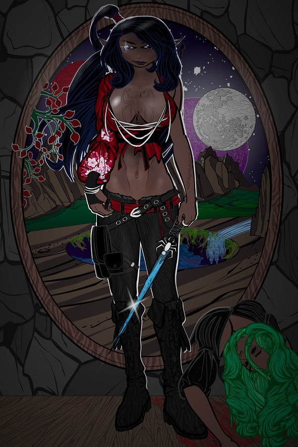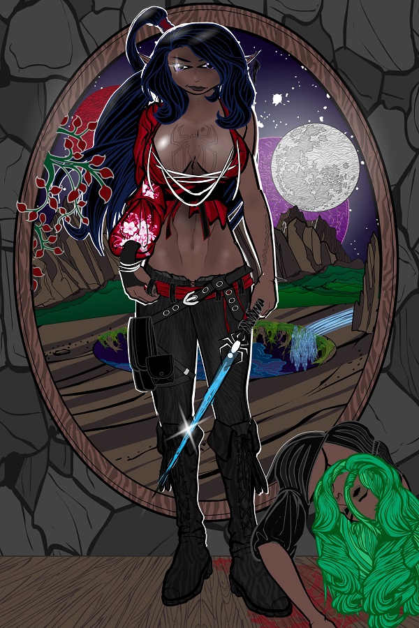 As for the character, she is an assassin. Her typical ‘top’ would be more of a ‘gi’, but the whole image was getting saturated with black, so I took the liberty of giving her a more colorful outfit. The clothing is largely velvet (in fantasy stories, thieves and assassins are always dressed in leather, which is both reflective of light and loud/creaky, which doesn’t make sense to me; velvet absorbs light and is quiet by contrast). Her blade is a hollow glass poniard-style dagger. The hollow design allows it to perforate flesh more easily, while the slimness allows it to fit between armor chinks. The hollowness also speeds exsanguination much the way a hollow needle does. If she strikes a vital artery, her target can bleed out in 30-60 seconds. You can’t see in this version, but in the original design of the blade, there is a score mark about 1/3 of the way from the tip of the blade which allows the blade to be broken off in an opponent, keeping the wound open and leaving shards in them to further then chance of assassination. She can also coat her blades with anti-coagulants to exacerbate the effect and prolong bleeding. The glass blades ‘socket’ into the bone grip (also wound in black velvet), so they can be replaced after each fight. She keeps more wrapped in individual padded sheaths worn at the hip/thigh.
