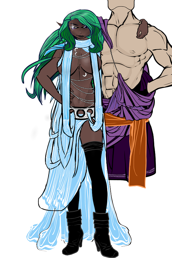 vespertineParticipantOkay… so, I really need some help/suggestions on this one. It started as a sketch, hence all of the crazy lines towards the bottom of the dress. I think I got in over my head a bit, and I’m not sure how to progress. It’s been sitting in this state for several weeks now. The idea was to have the dress appear to be hanging in loops which then feed into the belt. Not sure if the desired effect is starting to show? I started out using ‘belt’ items for the dress, but after I added the male figure, I realized I could probably get a nicer effect using ‘cape’ pieces. Ideas?