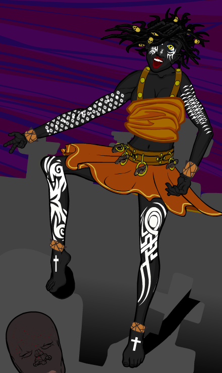 Anna Phylaxia, in true Santeria tradition, ‘appropriated’ the tradition of phylactery, ‘meaningful’ words, phrases, and intentions in little leather boxes on her wrists and ankles. Her most common one is ‘hives’ as depicted in this scene of her inflicting a punishment while dancing atop gravestones.