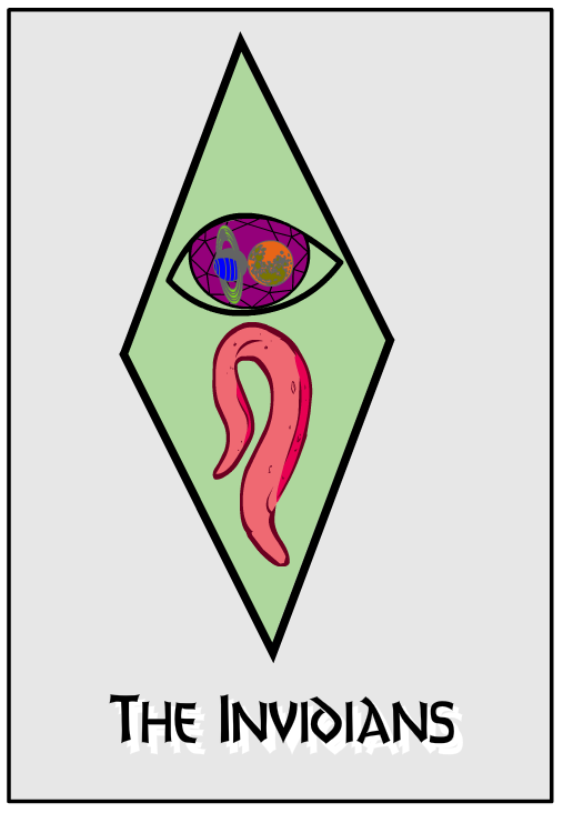 The Invidians Logo: Invidia liked the poison tongue and the double pupil of ancient legend. She only ever liked one hero comic–the Incredibles. She took the lower case ‘i’ and the two anatomical features, declaring that in HER team, there were at least four times the importance of ‘i.’