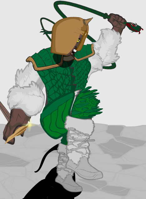 Phaedra, AKA Doral Em’Lan is an unusually robust specimen of Aelurian. Large and freakishly strong, agile, and fast for her size, she also has the rarest trait of all their best hunters. With each of her two non-nightvision eyes, she ranges more into the ultraviolet and infrared than most. Aelurians typically have necks that can turn 150 degrees in any direction, allowing their concave faces unusual sensory range. Though they don’t look catlike at first, their fur, balance, acrophilia, whiskers, nightvision, and hatred of water, not to mention their diet, categorizes them as feline, while skeletally humanoid excepting the feet, teeth, and claws. Aelurians are uncommon for their tusks and mouths being mid-torso.