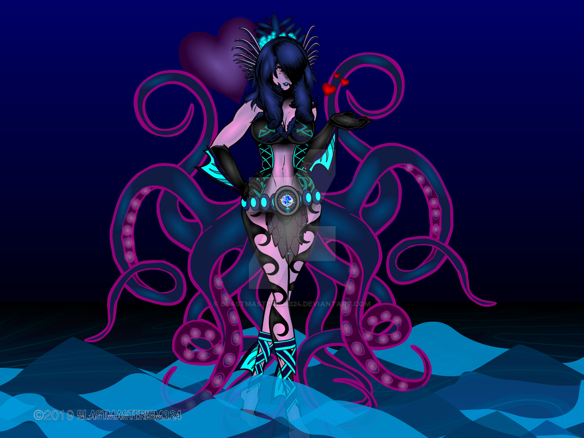 Kraken’s Widow is a hybrid between woman and octopus with the proportional strength and characteristics of the animal she’s based on; she’s strong enough to drag a sailing vessel underwater, and she is highly flexible, able to stretch and thin out her body to fit through openings others can’t. Kraken’s Widow primarily uses seduction and her natural charm when dealing with opponents; once she has them leaning in for the kiss, she wraps them in tentacles and drags them underwater to deal with them. She can non-lethally incapacitate opponents with a kiss thanks to a chemical in her teeth, and as a last-ditch resort, she can spit a blast of superheated ink to cover her escape.