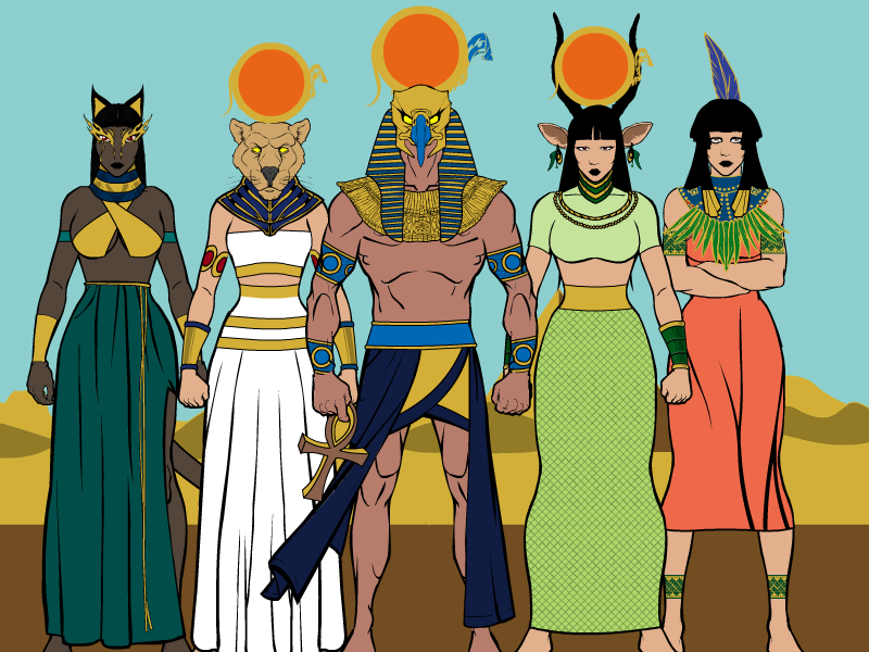 L-R (Bastet, Sekhmet, Ra, Hathor, Ma’at)