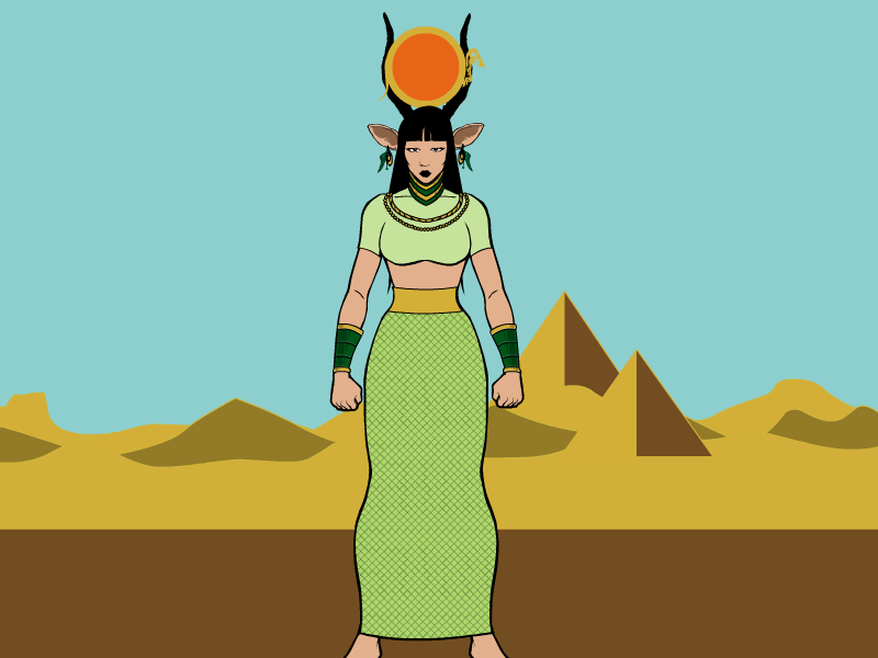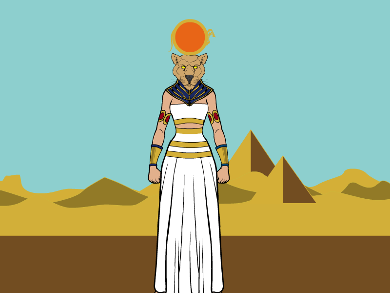 The fiercest hunter known to the Egyptians. She was one of the daughters of the sun god, Ra. It was said that her breath formed the desert. In one myth, Sekhmet was so filled with rage that Ra was forced to turn her into a cow so that she would not cause unnecessary harm.