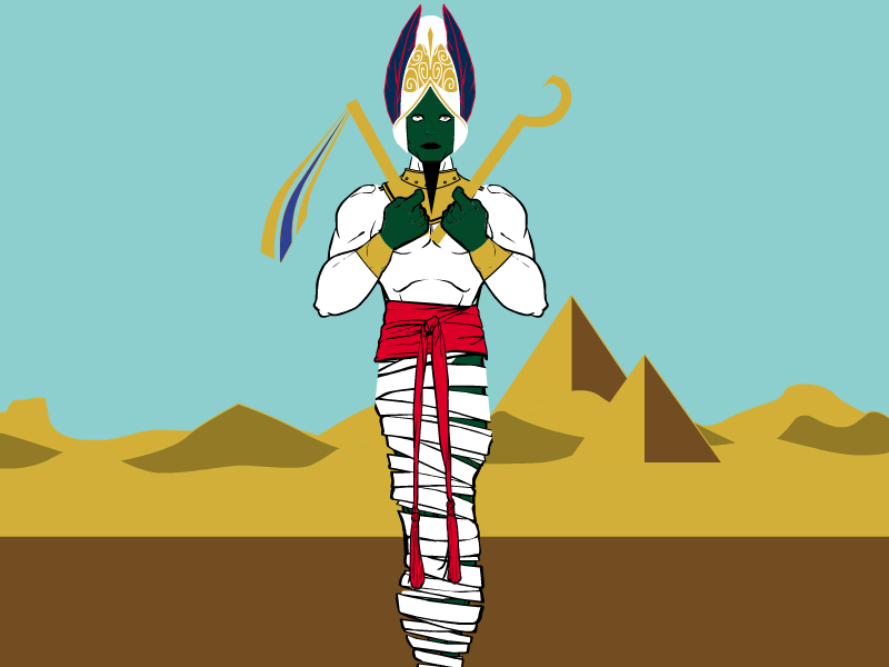 He was classically depicted as a green-skinned man with a pharaoh’s beard, partially mummy-wrapped at the legs, wearing a distinctive crown with two large ostrich feathers at either side, and holding a symbolic crook and flail.He was at times considered the oldest son of the earth god Geb, and the sky goddess Nut, as well as being brother and husband of Isis, with Horus being considered his posthumously begotten son.