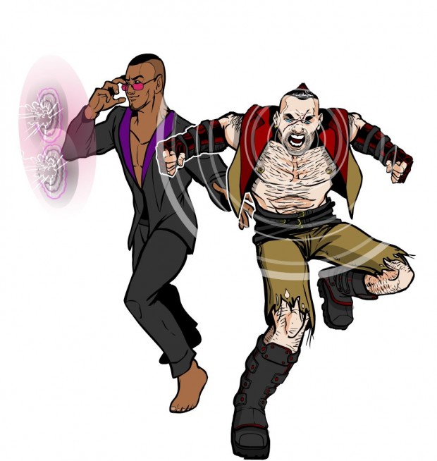 DiCicatriz and I have finished work on his prize for being the overall Friday Night Fights 3 champion. It's a duo of his original characters, Wraith and Howl. Here they are in black and white (click to embiggen any of these):