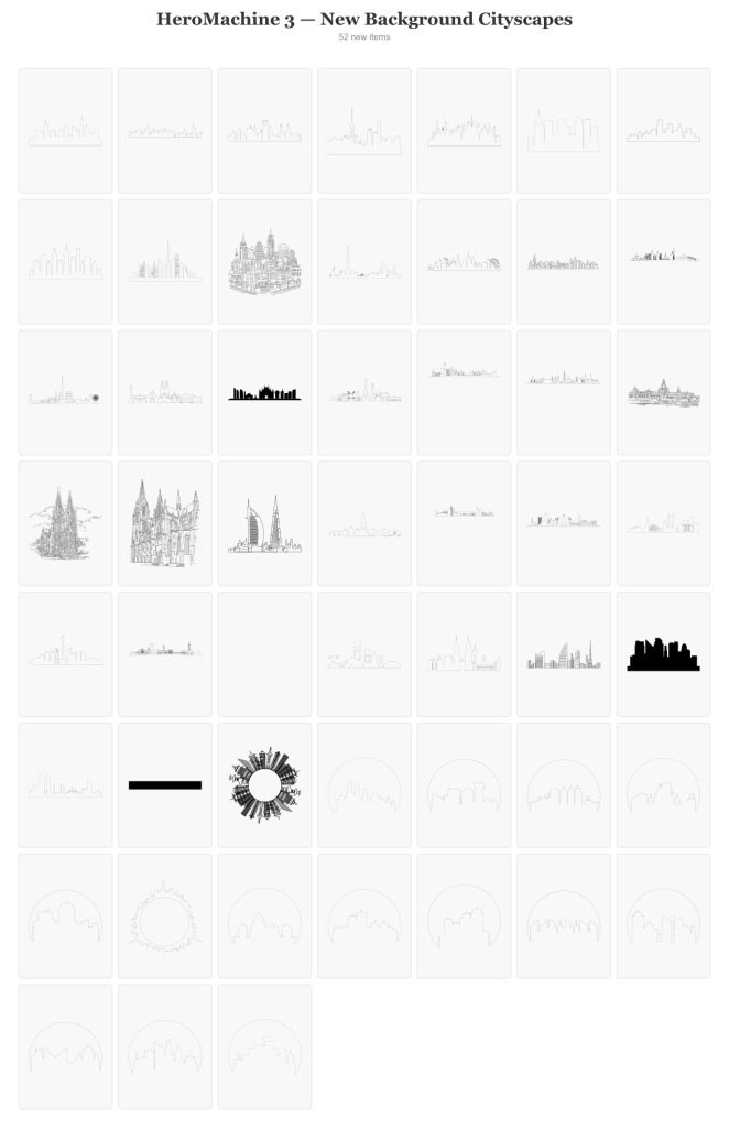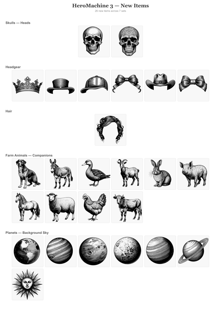 To celebrate the launch of HeroMachine 3 Phoenix Edition, which went way better than I even hoped it would, I’m launching another set of new items. They’re in a classic old-time lineart style that I wasn’t sure would work but I think they’re pretty cool. Give some of the planets a try, changing the lineart color in particular, it gives some wild effects. Let me know what you think of this approach.