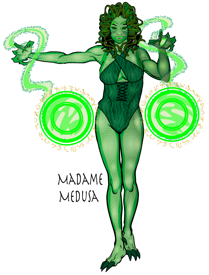 Ralindria was a beautiful fey nymph who angered Lady Mab of the Seelie Court. Mab complained to the King and Queen and Ralindria was transformed into a hideous medusa creature. Drak’Kar Zul took her in, promising to return her to her normal form and Madame Medusa became his loyal servant and arcane student. Madame Medusa was sent to earth to direct the affairs of Drak’Kar Zul’s Daemons and place them back on track after a series of defeats due to bickering between members of the minions. She uses magic to pass as a human under the name of Brianna. Madame Medusa is a spellcaster of great power able to cast offensive and defensive spells including her favorite spell of petrification.