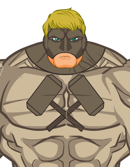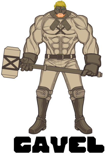 Jack is the younger brother of the hero Defender (Jim Reynolds) and the son of retired hero Chief Justice (Rick Reynolds). Both brothers wished for little more than to live up to the legacy and the expectations of their hard-nosed, no mercy father, but little Jack watched his big brother fail because his heart was too soft. Despite the fact that Jim grew up to be a successful public defender and, later, a popular superhero, old Rick was never impressed by his older son’s affinity for compassion and sensitivity. So Jack followed closer in his father’s footsteps. He grew to be a massive man, and he adopted his father’s black and white view on justice and punishment. He became the hero Gavel, wielding a huge battle hammer and little patience for any criminals walking the streets of Caligo. Even now, though, at the height of his crime fighting career, Jack’s biggest weakness is the frequent disapproval of his father, who gives him much more discouragement than praise.