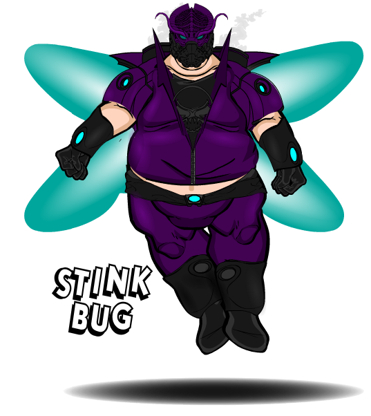 Stink Bug is exactly as gross and obnoxious as his name suggests. His body generates a number of noxious and sometimes toxic gasses which he is all too keen to use in his enemies or just anyone who gets in his way. Stink Bug is only outmatched in terms of sheer size by the Goliath Beetle. His wings, stolen technology created by the inventor Static Buzz, have been heavily modified but are still barely capable of lifting him off the ground. In flight, he is slow and ungainly. This has been the saving grace of many of his opponents because once the Stink Bug gets a hold of you, the fight is practically over.
