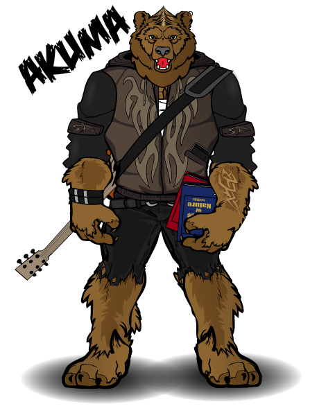 AnarchangelParticipantA while back, I created a character named Cub, who I can’t remember if I ever actually posted. He was basically a bear cub in a school uniform and was probably the result of reading too many issues of Wolverine and the X-Men. I filed Cub away and forgot all about him but I recently came across him in my files and kind of became intrigued by the idea of a grown up, college aged version of him. Just a great big bear man, trying to make his way in life. And so I came up with Akuma, big bear on campus.