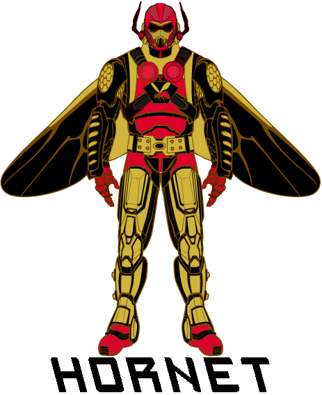 He was the sidekick to Yellow Jacket until the hero was persuaded into evil. Now the Boy Hornet has begun to train himself in the ways of crime-fighting, determined to be a self-made man and hero. He has no special abilities, but through fierce training and rigorous exercises may one day emerge as a formidable warrior. He also has pangs of vengeance in his heart for the ugly scars left on his face in the battle he was forced to have with Yellow Jacket. 10 years after Yellow jacket’s betrayal, Boy Hornet has become an adult and changed his name to simply the Hornet. His Hornet Suit allows him to fly with mechanical wings, and gives him a small amount of body armor.