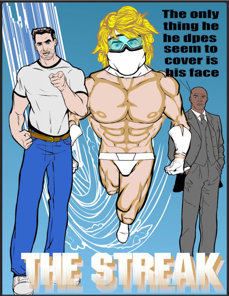 But he didn’t die. He flew. He flew back to the plane, got under it and helped the plane land safely in the bay.On this first discovery of this power, his clothes didn’t hold up to the job of super heroing, so on his first day out, due to his speed to move so fast to be a blur and when he stopped it was evident, his clothes didn’t make it, it earned him the name The Streak!