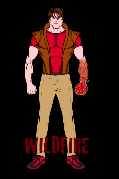 Powers: Fireproof, can throw fireballs, can turn all or part of body into pure flame, super speed/strength/endurance when in flame mode.