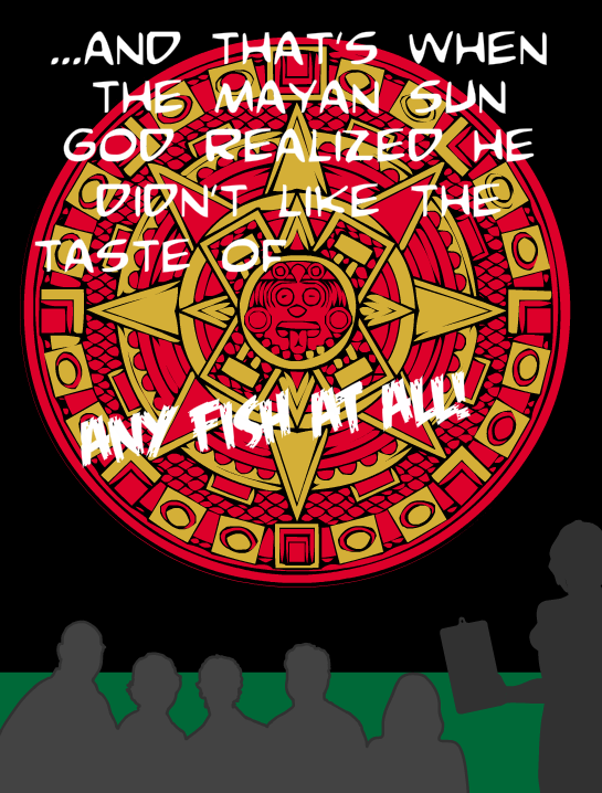 Herr DParticipantOk, so, you know how all those depictions of Mayan deities look like they were sick? Imagine a tour guide finds the reason in Mayan lore and includes it–