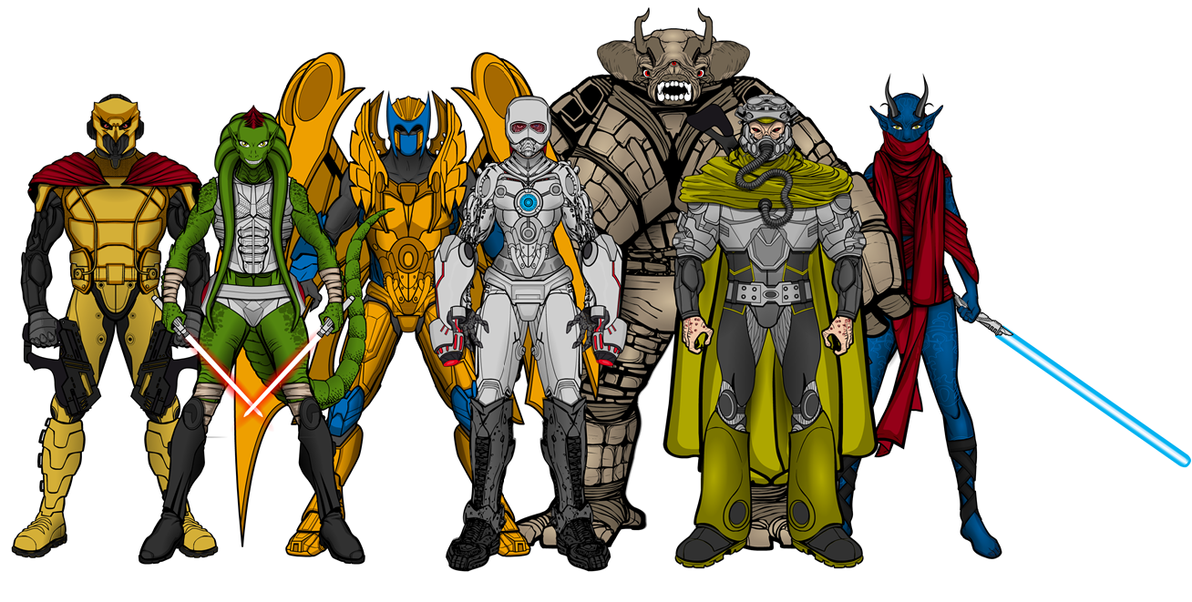 LtR: Aesia Kael, D’Jala Ren, Arya, Tyra Revenant, Grawrp, Kett Nova, Mira Abina