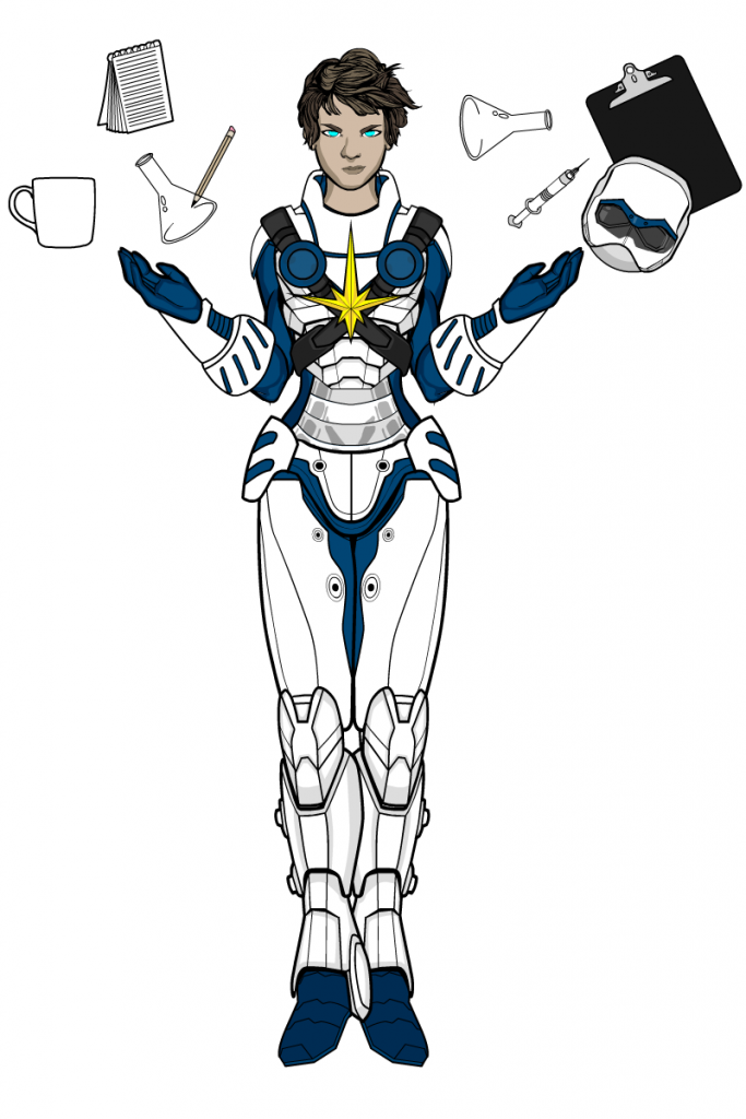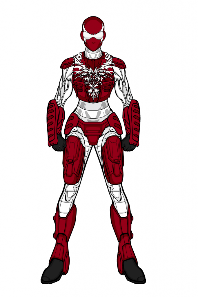 JR19759KeymasterIn her early days of being a superhero, Kate Quinn used to fight crime in what were essentially just a modified jacket with her logo on it and a pair of large goggles, along with a t-shirt and some tights. However, when she met Chipungu (Chi) Tshuma (Bateluer), she got a costume upgrade. Recognising the inherant danger of Kate fighting in her street clothes, Chi redesigned the entire outfit, utilising fabrics from her home country that had been used in the making of her own costume (and the uniforms of the Nguvu military). Not only did the new costume give Kate much more protection without impeeding her mobility in any noticable fashion, it also fully covered her face, lessening the risk of her identity being discovered by a mask malfunction.