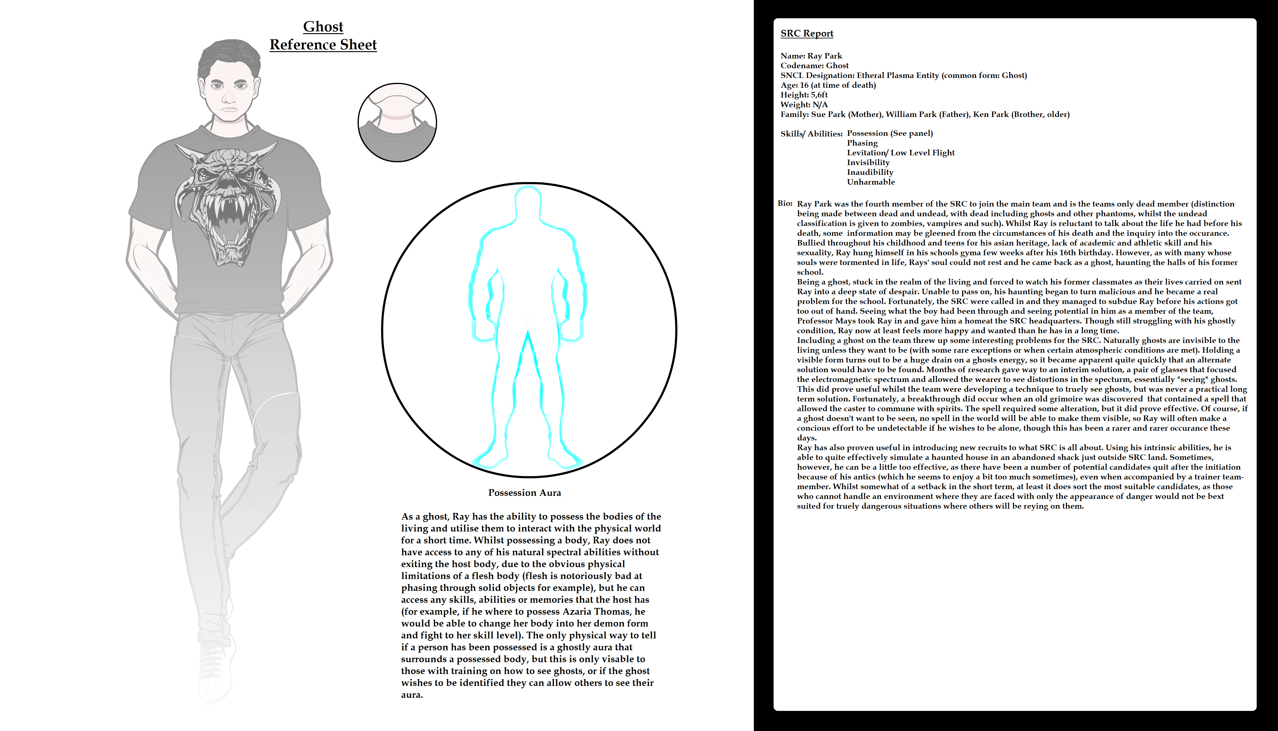 So, these are the last two characters from the SRC redesigns. Originally I was going to have them individually in reference sheet shots like the other 5, but as time passed I was struggling for things to put into the reference sheets. The only new things are Richard Mays having a false leg after his possessed daughter kinda… tore off his leg, and having an explaination for the markings on Sam’s chest and arms being from when she was used as a sacrifice to bring a demon into this world. But all the rest of the information (certainly for Richard Mays) is laid out in other reference sheets, plus with them not being active members of the team, there’s not much in the way of powers to show off or alternate forms to make the reference sheets interesting, so I thought I’d just put them together, post them and get them out of the way, because I’ve done some other stuff since this and want to put that up but also didn’t want to post anything new before finishing this series so there we go.