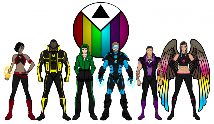 Right then. Big difference from the Pride team that we saw in my last set of designs back in 2017. So, what happened. Well, I tried to write a Pride comic and it made me realise a lot of things about the team. 1- Too many members. Pride back in 2017 had 10 members (and that’s not including the two people that made up one of the members). I cut out 2 members and still ended up basically ignoring one character entirely for the 1 issue I wrote (now, obviously I could have worked around this if I had staggered introducing team members, but the problem still would have remained). 2- The powers most characters had originally just didn’t work from a story telling perspective, for example White Lie. Way too overpowered.So, we’ve had a rejig. I’ve condensed 4 characters into 2 characters, got rid of one character (which is a shame because they were a cool concept, if unwieldy, but I salvaged the costume), changed everyone’s powers (with only one exception, I think)/ codenames and, of course, moved Manara over to The Protectors, because there just wasn’t room for her. We’ve also had a switch around of colours and of sexualities/ gender identities, but that’s a story for later.