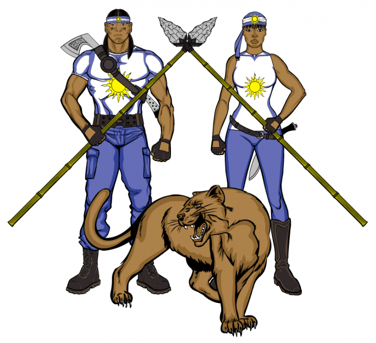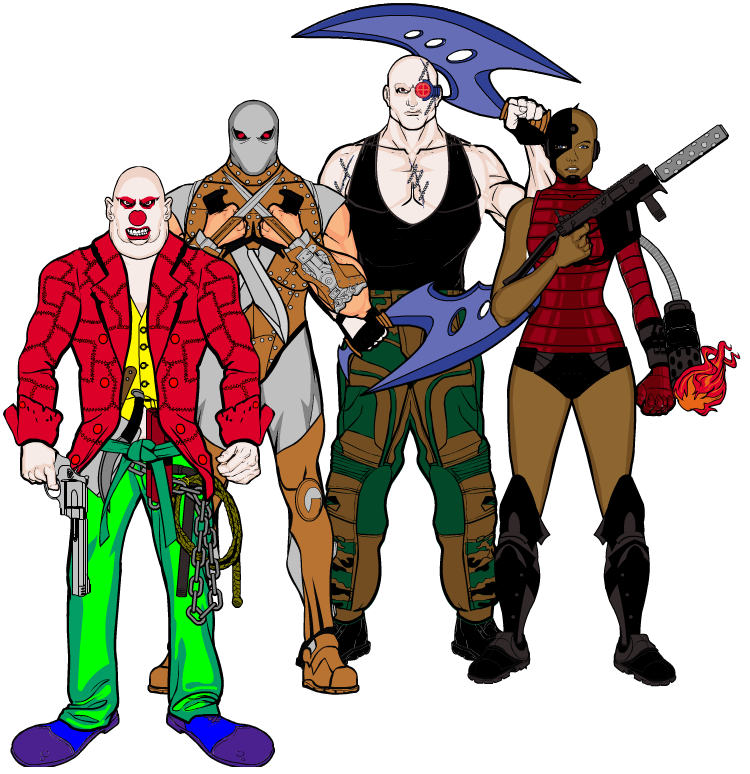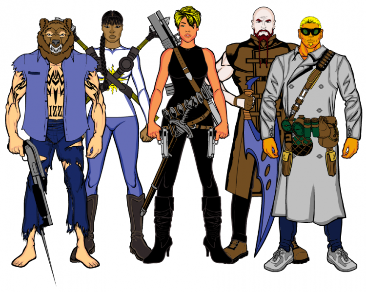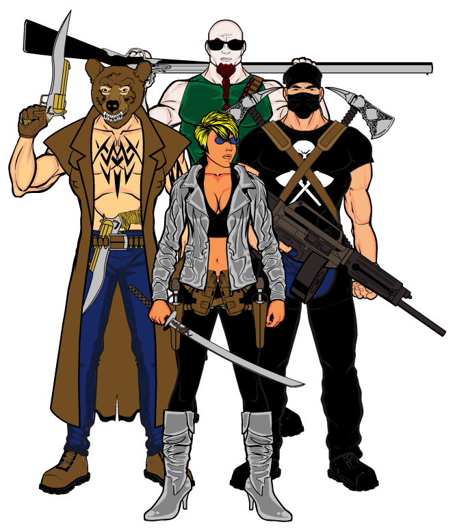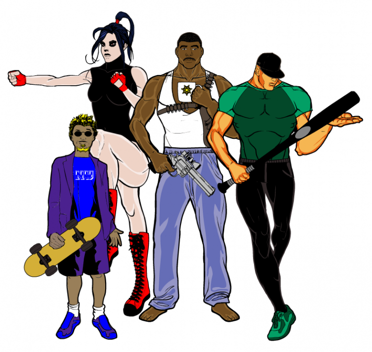 Alfredo “Hand Cannon” Mercurio (middle), ex-sheriff of Velorios, joined in when battle ruined his morning coffee ritual. Tatyana “Goth Punch” Ratchenko (back), gold medal kickboxer, when her training to control her bad temper got interrupted. Walter “Shorty” Appletree (front left), expert skateboarder, when his means of transportation was eaten by Amorpho and built a faster, more powerful one. Thomas “Slugger” Thompson (front right), ex-baseball player, when his town was attacked and decided to bat some heads out of the field.