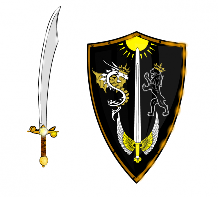 I designed this for the great-grandmother of my character, Aura. She was Queen Areta, peerless Warrior and monarch. Her single-edged Blade, named Venatoas (Bright Sun), bore a flawless yellow diamond, a golden hilt, and was wrapped in the finest of leather. Her shield was painted with several symbols: the gold and silver royal dragon, the black bear of her family, the winged sword of the Warrior Order, and the golden sun representing herself and her Blade.