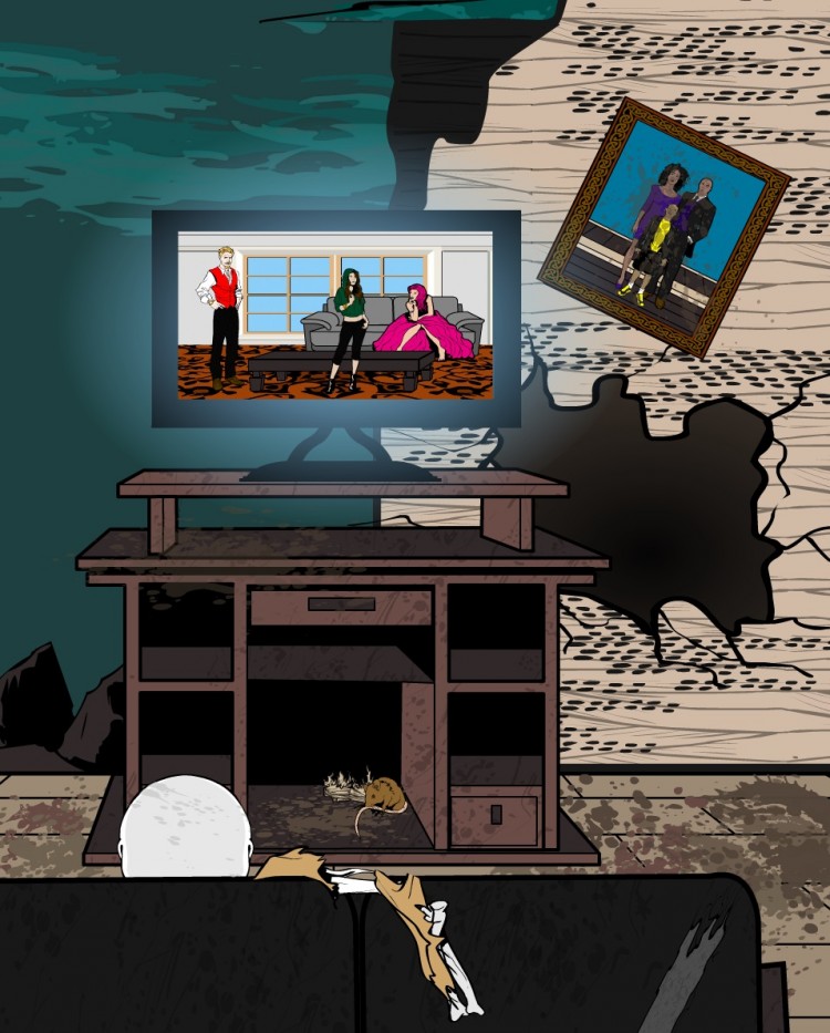 Not that I’ve been plugging a lot of time into certain post-apocalyptic console-based entertainment lately (as eyes dart around suspiciously). But I had this idea at work, so I gave it a shot. I call it ‘The Show Must Go On’. Just don’t ask how the TV is still functional, because I have no idea. Plot convenience, I guess? In my mind, the show playing is a cheesy sitcom of some sort, laugh track and all as a lovely contrast.