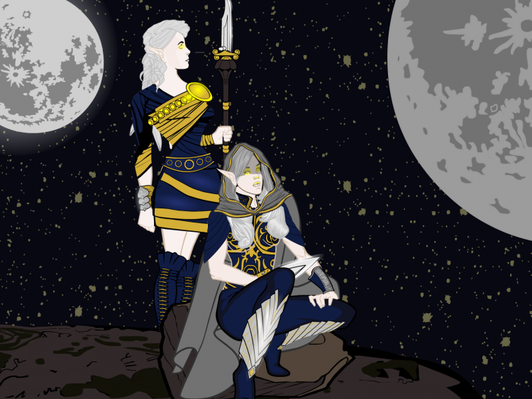 Seina and Pospera- Two daughters of Lorto and Vassall, and the moon goddesses. They were the only ones left after the great conflict, as they refused to participate in their siblings’ war. Theirs are the only moons that remain, the others having been destroyed or lost. Both are silvery and white, almost elf-like and ethereal, but stand as ready guardians of the night should any of their siblings try to return from their exile. Pospera, the youngest, carries a bladed staff and Seina, the second-eldest, carries a katar and sometimes a large, round shuriken.