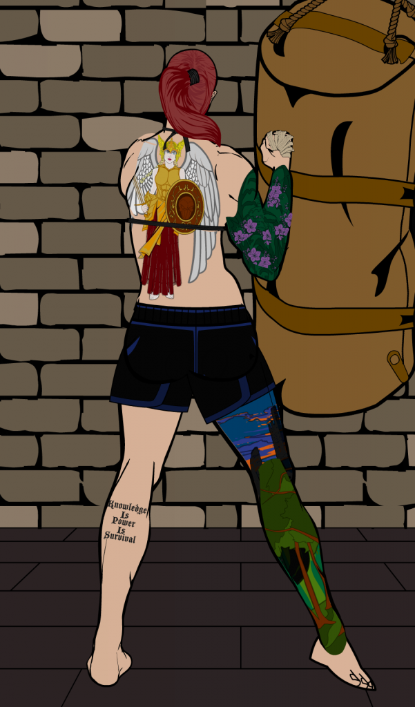 Sareene Hallon- Teacher and part-time Security Force member in post-apocalyptic New Burns, Wyoming. Visible tattoos in this picture: Valkyrie Warrior back piece, right arm memorial sleeve to those lost, left leg inspirational phrase, and right leg sleeve of a city overgrown by nature. She has more ink than this, but I wanted to show off the back piece with this picture.
