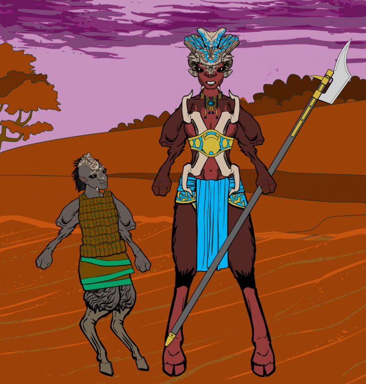 Classified as Extraterram Cervus osteoaspis by the first human explorers to their world, this species refers to itself as Mellijum or “Ones of the Grass” ( as the closest translation). These first humans defined them ‘as if an ankylosaur and a deer had a baby’, though much of their bony outer defenses have shrunk or disappeared over time. What is left is the bony ‘harness’ across the torso, which anchors an intricate carapace on their backs. They also retain a complex, carefully cultivated array of horns, and a bony plate and frill on the head. Standing mainly bipedal and up to two and a half meters tall, the Mellijum have evolved large, three-fingered hands, though they can run on all fours for extra speed. Their outer, bony armor was used as a defense mechanism against a now extinct predator species which they describe as somewhat feline and incredibly vicious. Both species began to develop organized groups and civilization, although the predator species cooperated poorly due to their lone nature. They fought among themselves, with the Mellijum often caught in the middle. They were wiped out by a combination of warfare and diseases triggered by biological experimentation. The Mellijum left these places abandoned, preferring to use their technology to improve their farming practices, and for medicine, art, and music. They also have a deep knowledge of astronomy, though they choose not to pursue technologies to leave their world.This picture depicts an adult female and a juvenile. The society is grouped into castes, although the system is loose and inter-caste movement, although often complex, is allowed. The adult wears the blue and gold of the Defender caste, those which safeguard the people from threats. She also wears paint on her head crests, which is a usual form of cosmetic and is applied in different patterns based on a number of factors. The child wears the green accents to their brown clothing, marking him as Producer (farmer) caste. All children wear similar clothing made from certain tough grasses, as their protective bone growths do not fully mature until puberty. Even his head crest is small and his horns and frill have not yet emerged, putting him probably around the equivalent to an Earth six year old. His mane is also loose, whereas and adults would either be cut quite short, or elaborately braided down the back.