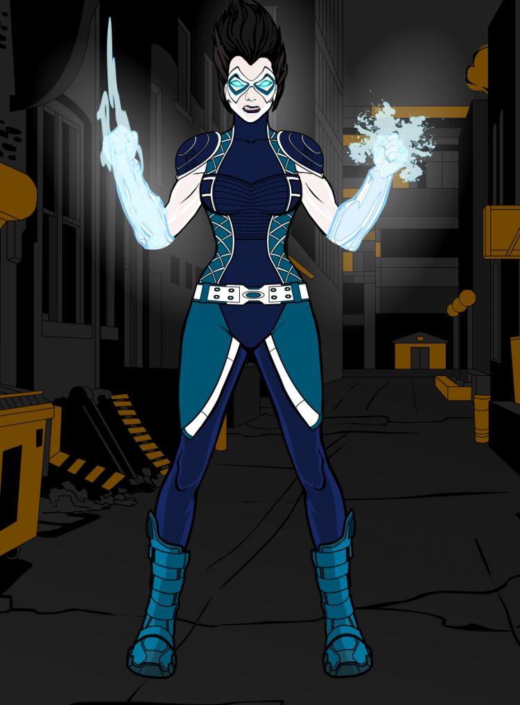 Original Bio: Skye Thomas was not born with powers. One day while playing outside with her younger sister, the two girls were caught in a radioactive beam from the gun of Gamma Man, a local supervillain. Her sister was killed instantly, but six-year-old Skye was thrown into a snow bank, where the radioactive particles mutated her. Her skin pale and eyes changed to an icy blue, but most of all, it gave her power over the cold. Now, eleven years later, Skye uses her powers to protect the children of the city from harm, whether extraordinary or everyday. She is able to shoot blasts of cold, call storms, and create ice projectiles, such as her Frost Knives. Calling herself Polara, she will make sure no children suffer while she has the power to protect them.