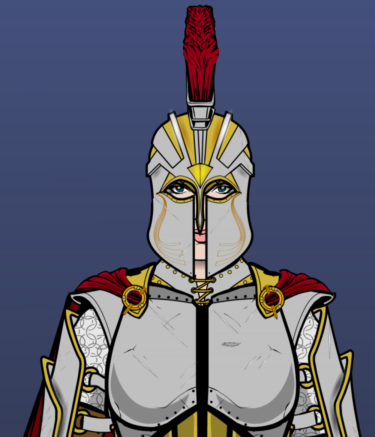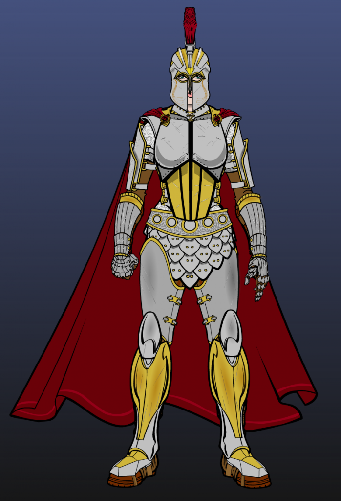 Armor this week? Now we’re talking my language. So here we have my character Evera, fully suited in a combination of plate and mail over leather. The armor bears the scores and scratches of use, for she is no knight in shining armor, but one who’s steel has been tested many times. With her respect for Greek culture and admiration of its warriors, her lord and lover gave her the scarlet cloak and the crested helm upon her ascent to command, that she may pay homage to her heroes. Though even these bears the marks of use, including a chunk sliced from the very front of the crest during a fight.
