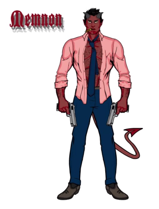 Weapons: 2 x 9mm pistols, tail, horns.