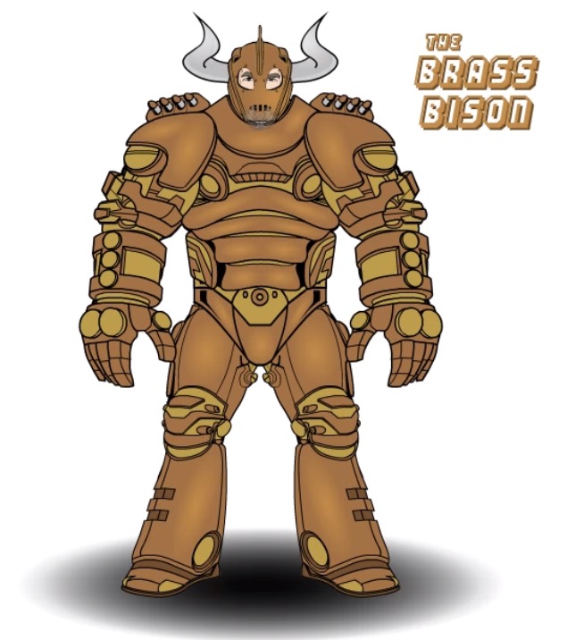 Habits/Quirks: An absolute mountain of a man, possessing extraordinary strength and size for a regular human, but little in the way of brainpower. Formerly incarcerated for trying to extort small businesses and running a street gang, as well as for his participation in illegal, underground cage fights. Known for organising similar fights while in prison, he was feared and somewhat respected by fellow inmates. When selected for a secret military program due to his prodigious size and strength, he found himself used as a guinea pig to test a prototype suit of experimental power armour – until he was stolen along with the armour by members of the Lawless Earth Network. Eagerly accepting his new freedom and the chance to become a truly feared criminal, he customised the armour and became The Brass Bison, a key enforcer for the L.E.N. and dangerous villain in his own right. In combat, his favoured method of attack is to simply charge the enemy down. Tends to suit obvious crimes, such as robbing bank vaults or armoured cars, extortion, etc.