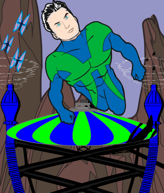Dave, of the HooFlop Diver Team, managed to place in this extreme sports event. The Hydrix ramp dive system manages to convert a vertical dive into a running flat dive where a contestant skips across the water like a flat stone by use of hydraulic emitters. He was triangulated as skipping 97.04 meters. The Moth Gliders, Dave’s famous cheering section, are captured in this shot right before a crash landing that caused the avalanche known as ‘the journalist’s funeral.’