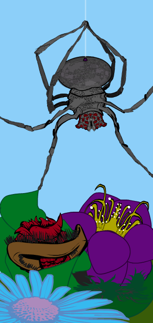 Herr DParticipantYowza! The footthing is the spider torso and femurs, the hat is the caterpillar and red flower, and the mask is in pieces to make the purple and yellow flower. Sorry, no costume.