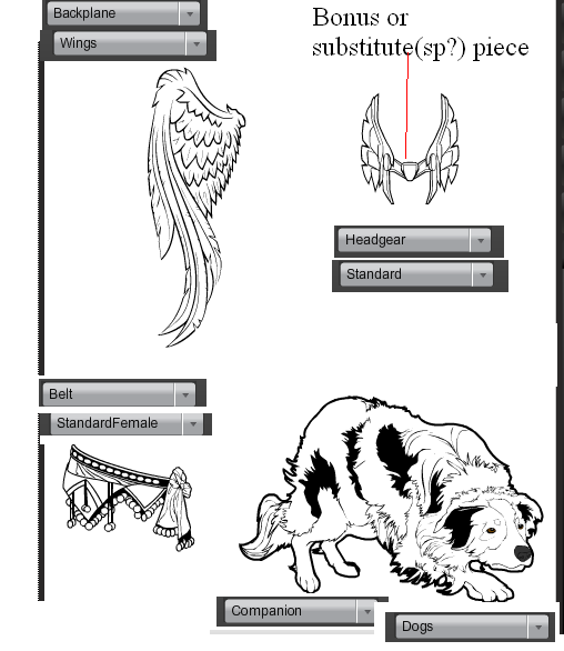 dog= cloud, wings=scarf, belt=medals on jacket, head gear= badge on jacket