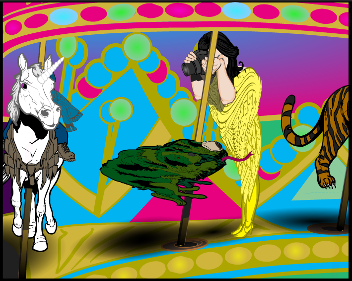 The belt was so interesting as was that I used two partial copies to make the carousel itself, so it became 80% of the background. The part that didn’t get used in the background became the son’s scarf. There are a few chilly nights right near close-of-season.