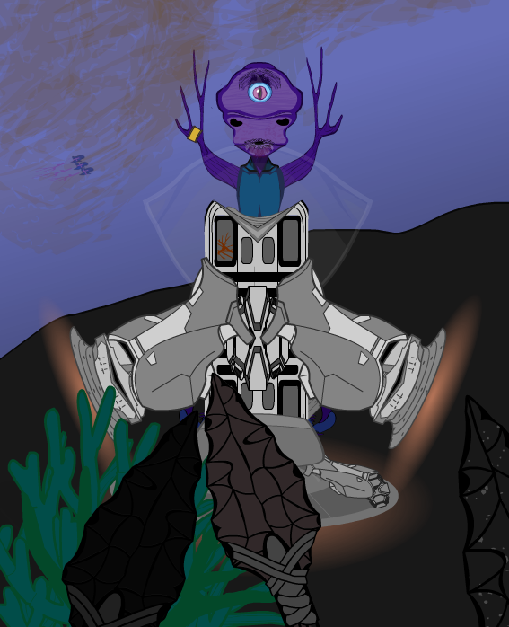 The helm was used in the land speeder, the haze in the sky, the wisps in the eye, and the little marks became a trio of fighters in the sky. The mechboot was used in the land speeder and the vapor trails. The antlers became hands and vapor trails and windshield cracks and haze and part of the shrub.