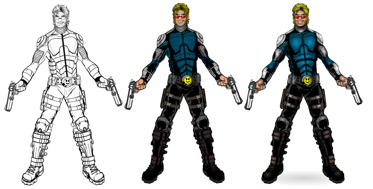 amsParticipantUpdating CRACKER JACK. Really like the face expression that I got after many attempts. I also include my pic Black and white, colored and then highlighted/shaded to show my progression. also my first 2 renditions of the character.