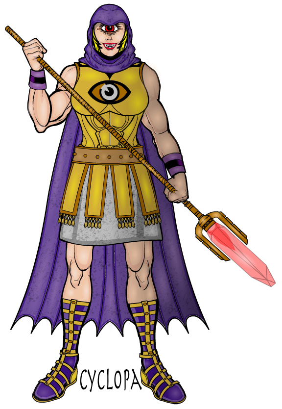 Cyclopa is a large and strong female with one giant eye. She is not sure how she became this way; she just remembers being found out in the mountains by Thunderlord and he gave her refuge. He showed her kindness when others gave her hate and for that she is forever loyal to him. Thunderlord used his wealth to have an energy spear and armor made for Cyclopa and she runs tasks for him. She consults with him on some of her more obscure visions. She is a good combatant and has enhanced vision with her one eye. She also has some precognitive visions.