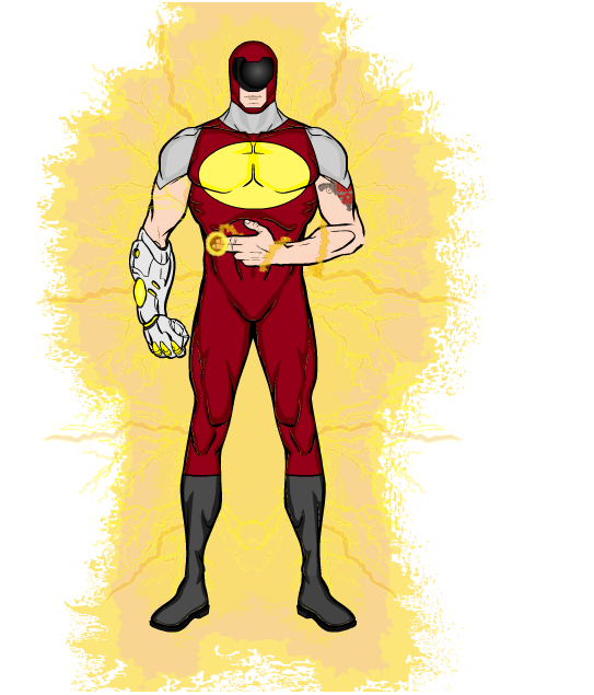 Triats/Abilities: Ability to absorb sunlight and project it into powerful beams of energy, Metallic Gauntlet capable of monitoring his energy levels, Ability of Flight, super strength.